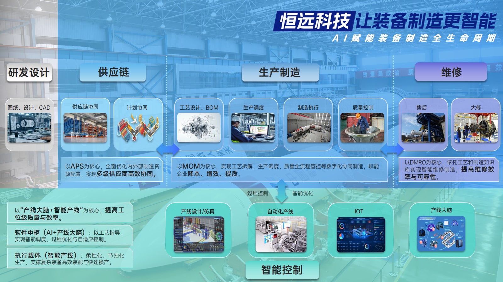 基于智能制造核心能力,恒遠科技橫向延伸打造裝備全生命周期總集服務(wù),構(gòu)建產(chǎn)業(yè)鏈數(shù)字化協(xié)同平臺與覆蓋設(shè)備大修維護的全維運維保障體系,形成貫穿研發(fā)設(shè)計、供應(yīng)鏈協(xié)同、生產(chǎn)制造到售后維修的完整價值鏈。